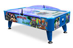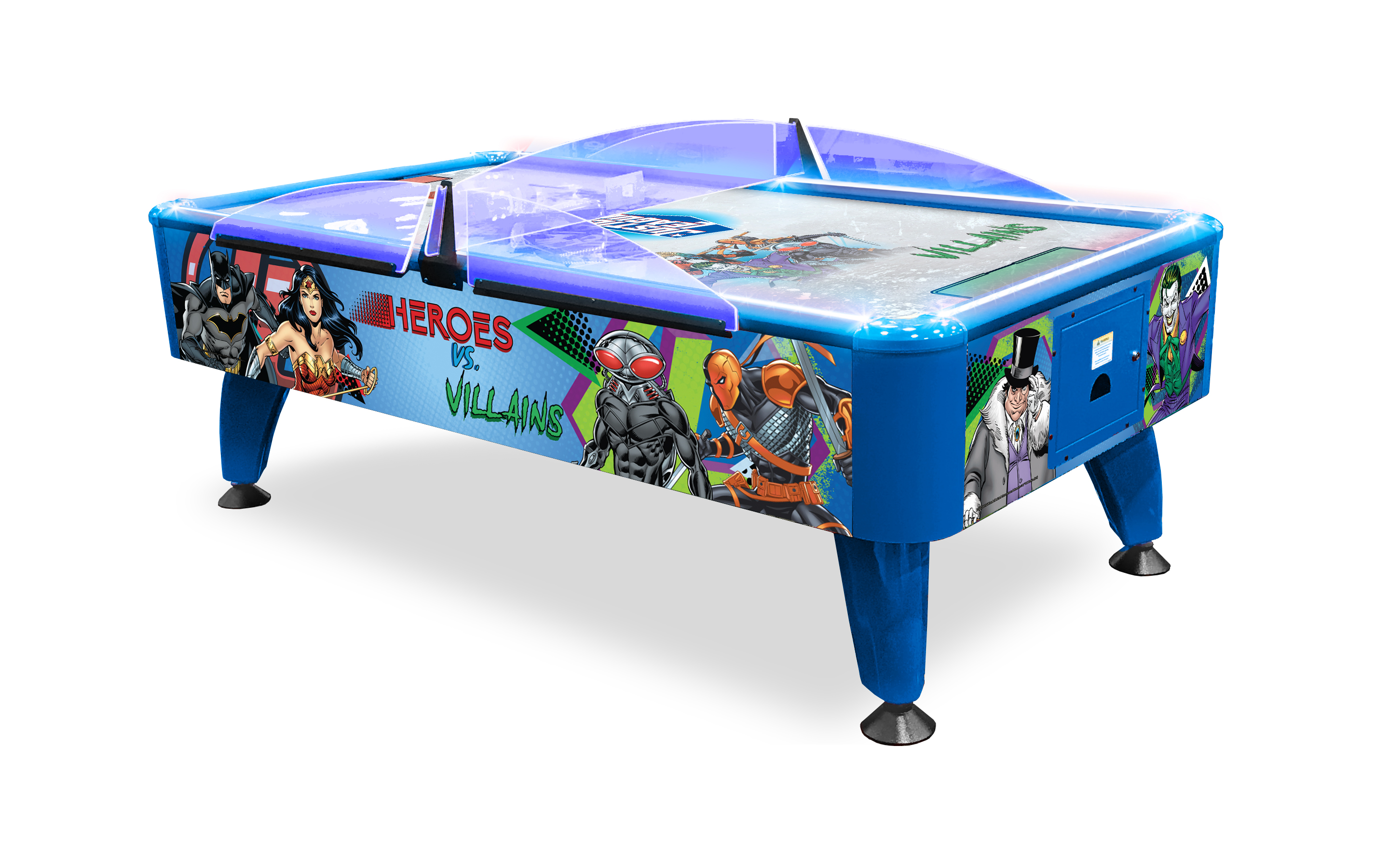 Choose your side, Heroes or Villains? Battle against the other team in this exciting new take on the classic air hockey design! This air hockey table features full motion LED lighting in the playfield, edge rails and in the legs to make this an attractive piece in any game room. The playfield will light up red or blue to let everyone know who has scored. This game also has exciting heroic gameplay music and action sound effects when the puck hits the table edges.