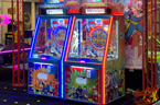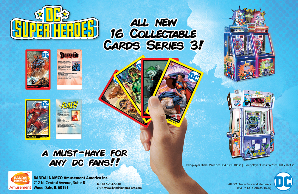 A brand new 2 player, closed loop, coin pusher with ticket payout and collectable trading cards featuring DC Comics Super Heroes and Villains characters.