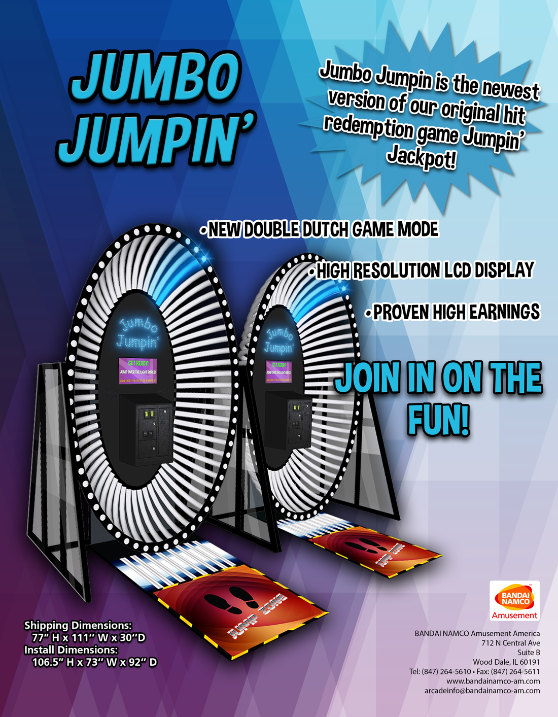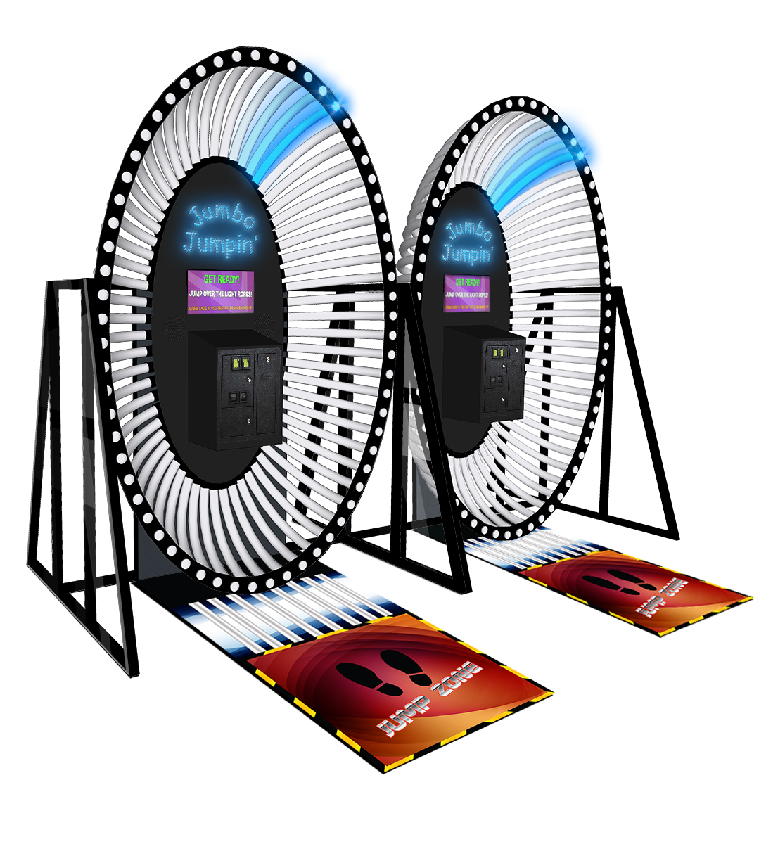 Jumbo Jumpin is the newest version of our original hit redemption game Jumpin Jackpot. The concept of the game is very simple: players jump over an LED jump rope. As players jump over the virtual jump rope, they will start filling a visual progress bar on the screen. As the bar gets more filled up, the speed of the rope increases. When the bar is fully lit, the player wins the ticket jackpot! There are multiple coin/jackpot settings giving players the ability to choose between different difficulty settings. This new version features a high resolution LCD display as well as different modes of gameplay between double dutch and normal jump rope.