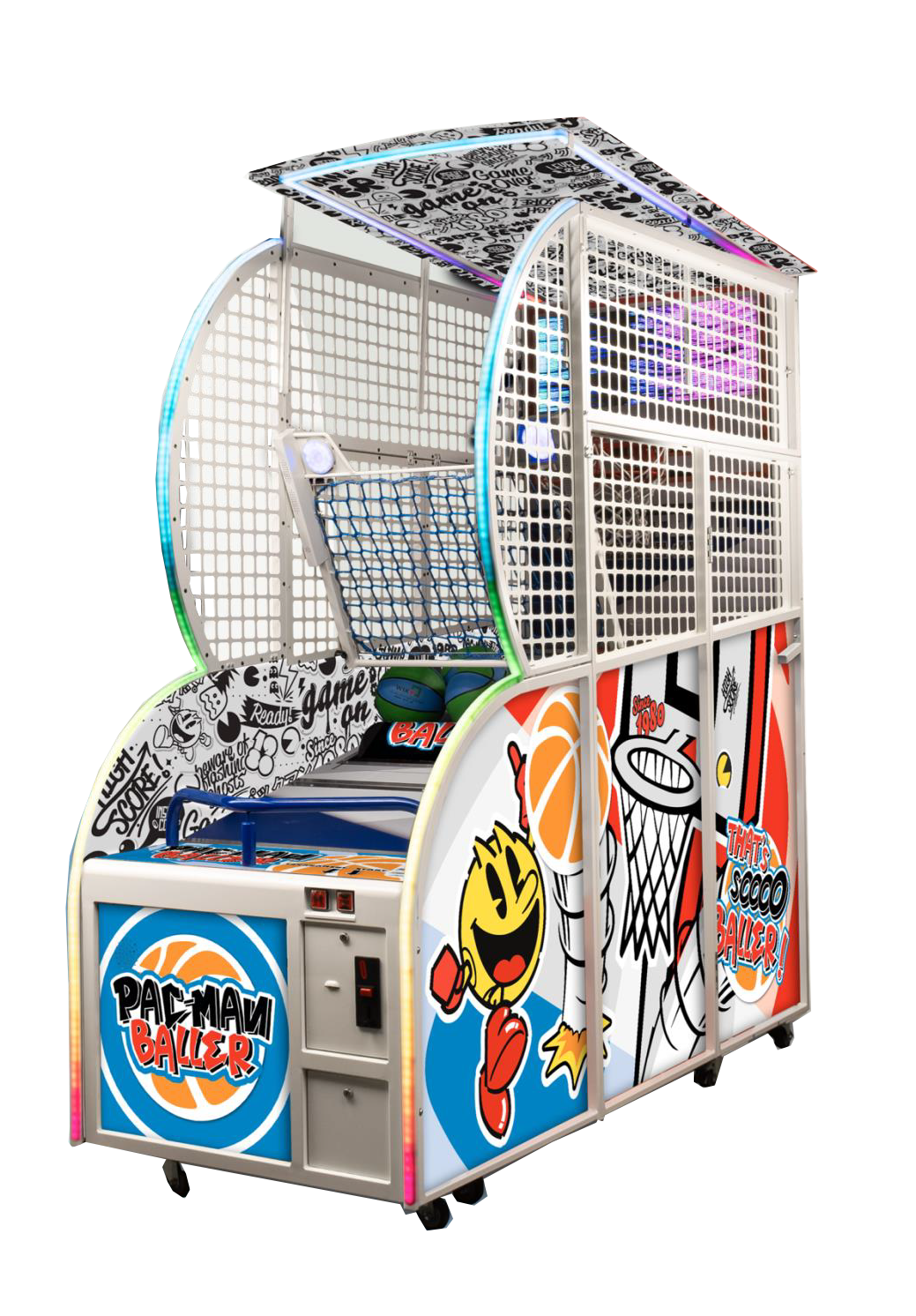 Alternate with friends to see who wins with the highest score! There are different levels throughout the game that increases the difficulty.The basket will move horizontally throughout the game to make it difficult to score. Features include high quality speakers and bass subwoofer with PAC-MAN Baller branded basketballs. Link up multiple PAC-MAN Baller units together to heighten the competition!
