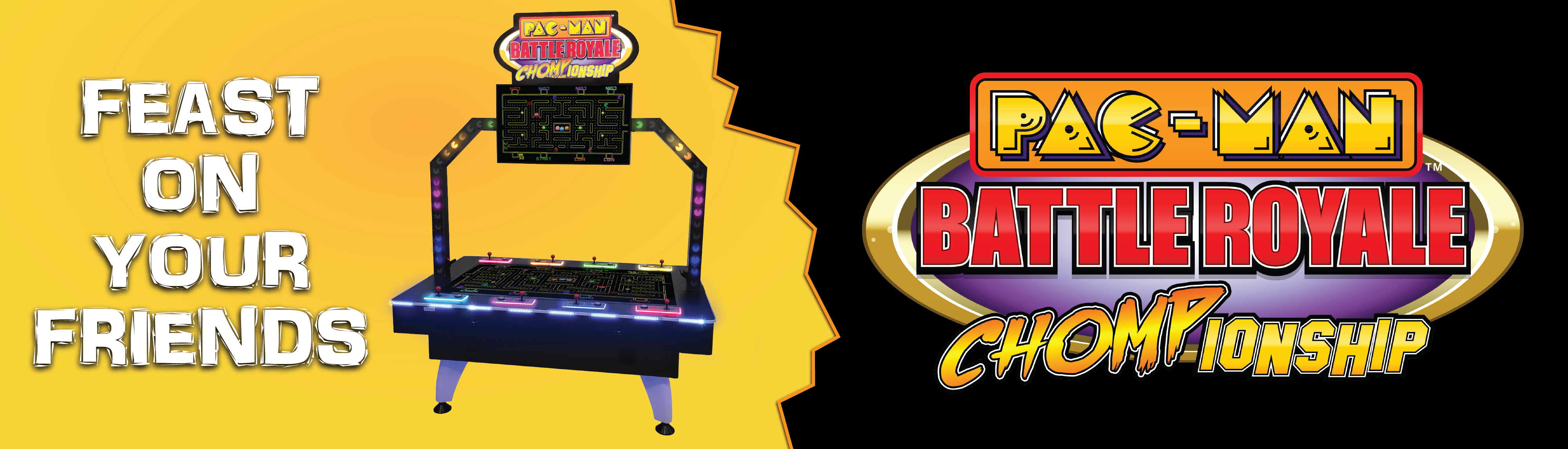 All new 8-player competitive PAC-MAN Battle Royale game on a 75” screen with 2 x 42” headers. Battle your friends and eat your way to leader of the Pac. Destroy ghosts and other Pac-Man in unique ways with all new power-ups. Simple. Fun. Addictive.