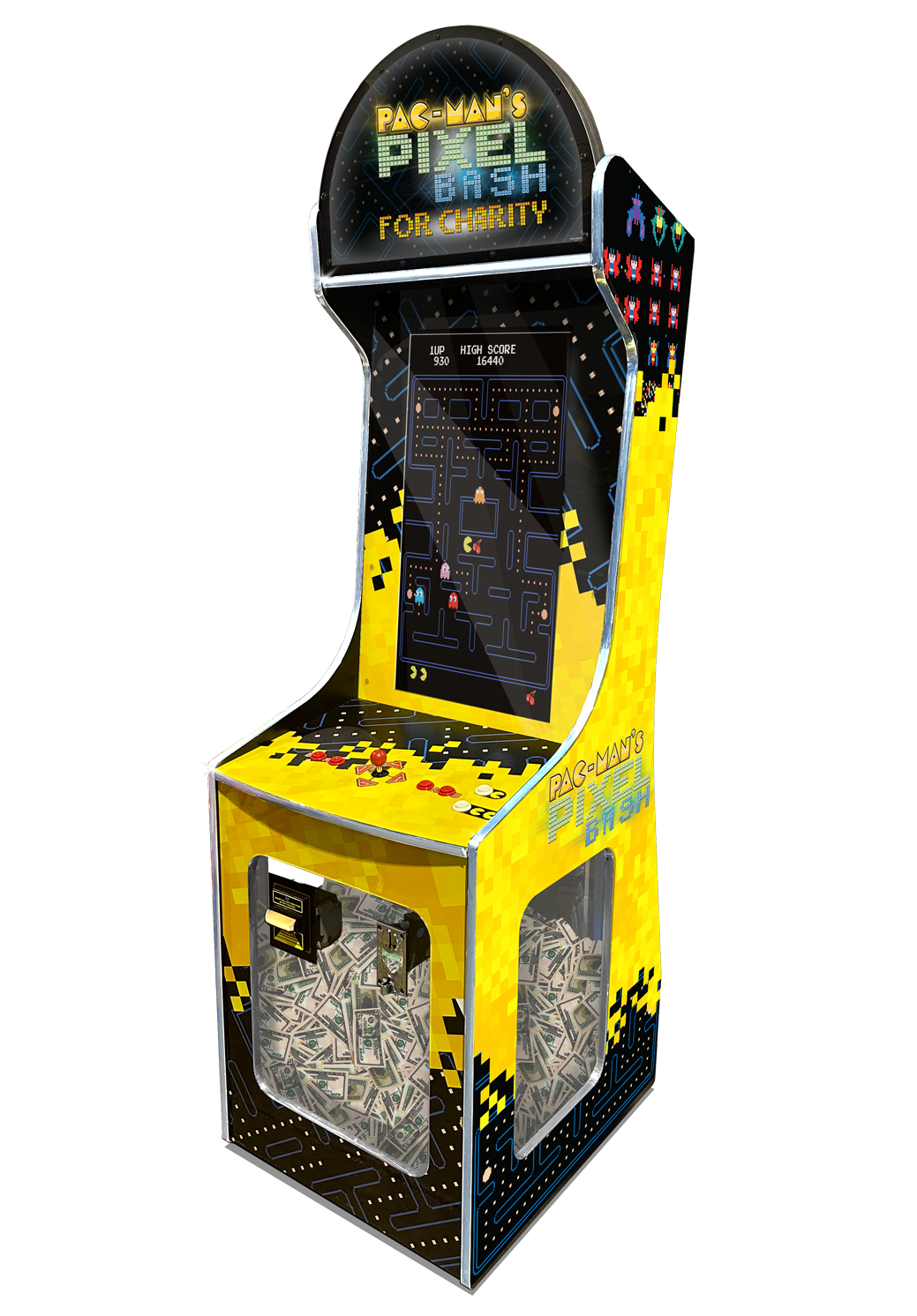 This version of the cabinet features a large secure see-through bottom which holds and displays all the games income through the bill validator and coin slot which you can use to donate to the charity of your choice. Show your customers an oppurtunity to donate to a good cause while playing PAC-MAN! The top marquee is customizable to display your chosen charity, contact your sales rep for more information.