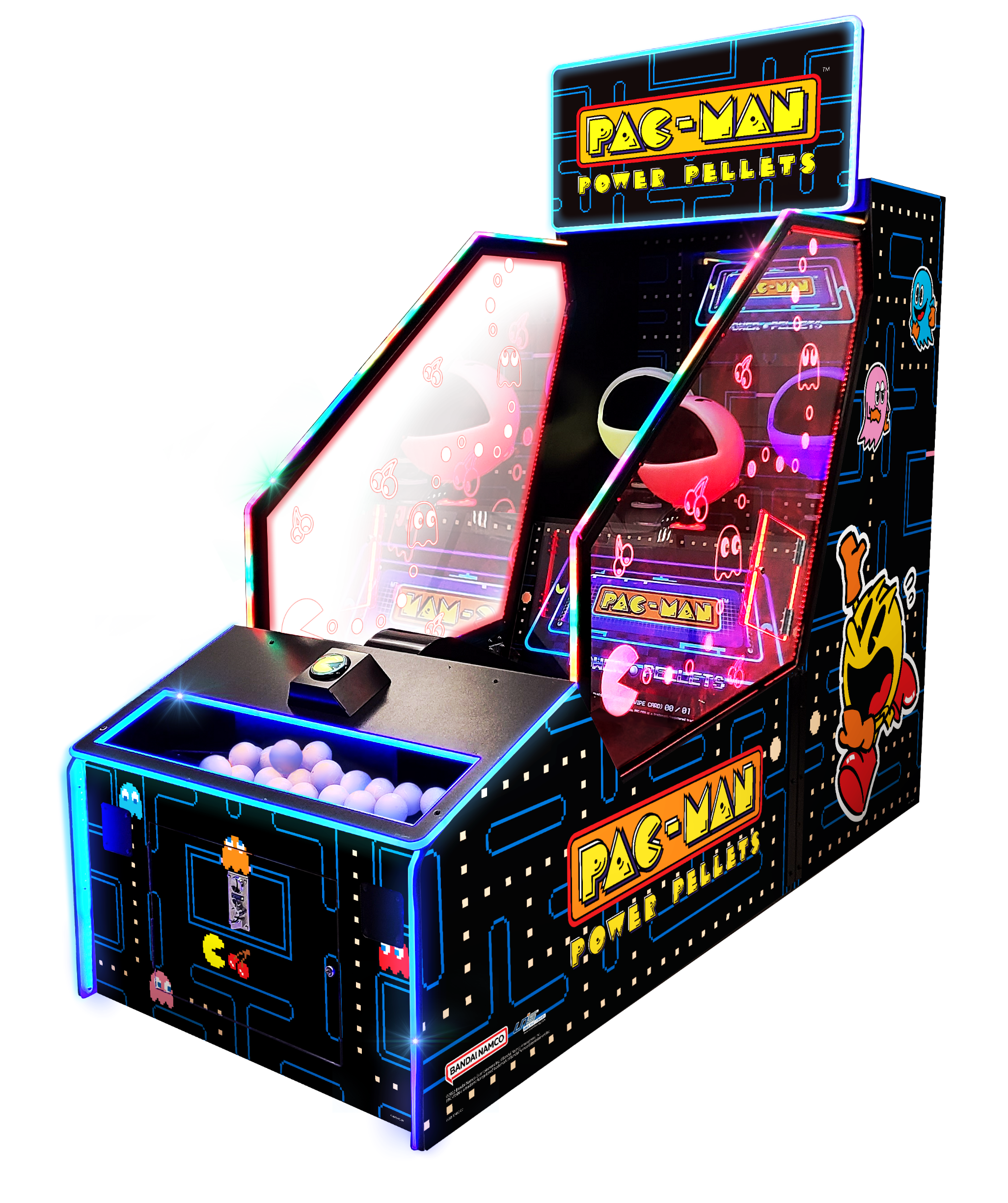 PAC-MAN Power Pellets is a time-based ball throwing game. After throwing the ball into the PAC-MANs’ mouth, a virtual ball will appear on the screen. The ball will drop into 1 of 7 positions and players will gain extra points. If the virtual ball lands on a power pellet, it can trigger a 10-second higher score mode indicated by the PAC-MANs turning blue. When the player reaches a certain score, there is an extra “Free Spin” after the game is completed, and the score is accumulated to the player’s total score.