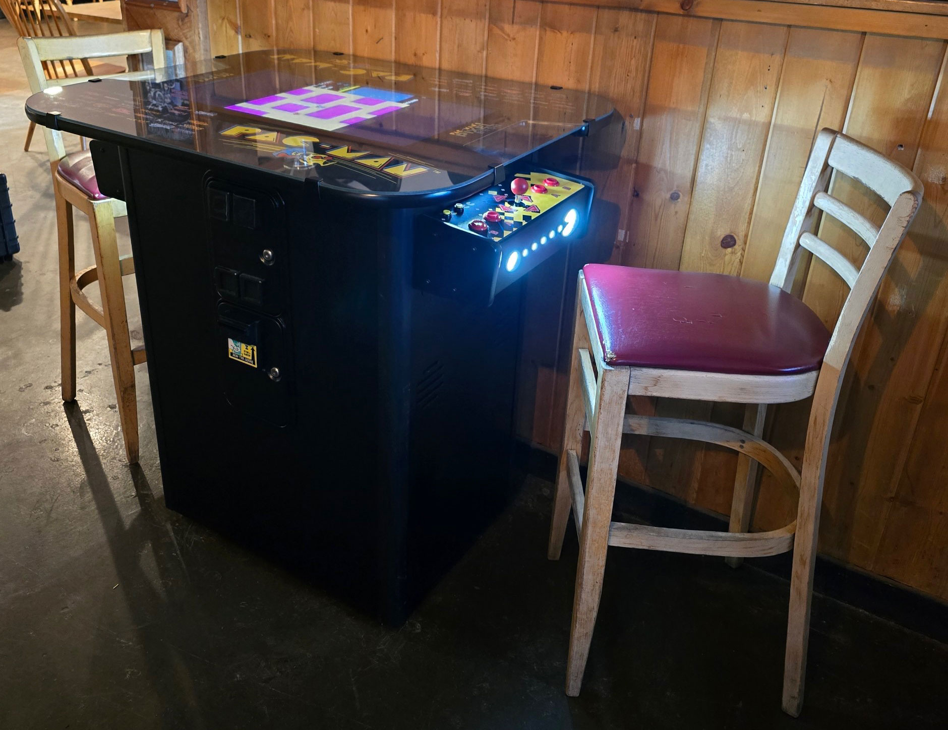 The next level of classic arcade fun for friends and family entertainment is here! Our brand new Pac-Man’s Pixel Bash Bistro Coin-Op is perfect for any home, entertainment center, or restaurant. With a new sleek design, durable tempered glass top covering a large a 27" monitor exclusive to the coin-op version, everyone is sure to enjoy it when they get their chance to play. The Pac-ManCave 30” Barstools are a great compliment to this Bistro!